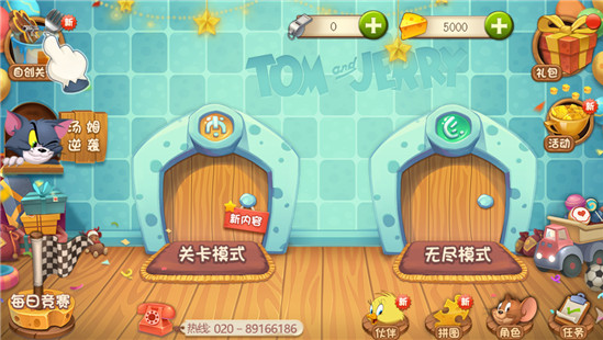当你进入游戏房间后,可以自由选择扮演汤姆,来感受追击的刺激。在抓住杰瑞后,将他绑在火箭筒上发射上天!不过呢,你也可以选择和另外三位小伙伴一起扮演杰瑞,在错综复杂的地形中游走,找寻奶酪的下落,在逃过汤姆的追捕后,一起搬运奶酪并从老鼠洞逃走。