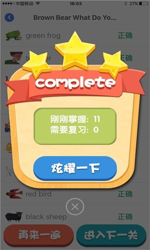 app是针对廖彩杏书单,依据乐玩英语亲子启蒙课的顺序,将每一本绘本的核心词汇、短语或典型句型,通过图片、gif的形式展示出来,让孩子根据听到的声音选择正确的图片。