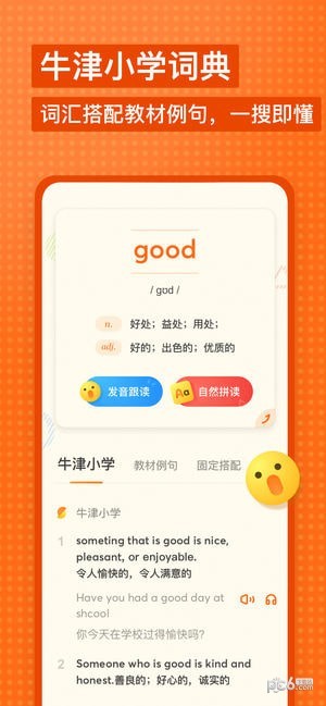 ·提供广义查词服务:无论是单字、单词、词组、成语谚语还是诗词歌赋,皆可准确释义。目前,app全盘收录《通用规范汉字表》中的八千余汉字,每一个汉字都专门配置了笔顺动图、跟写练习及真人发音;同时与《牛津小学词典》合作,收纳了四千条常用语的权威翻译,每个单词都配有音标拼读和动画辅助学习。