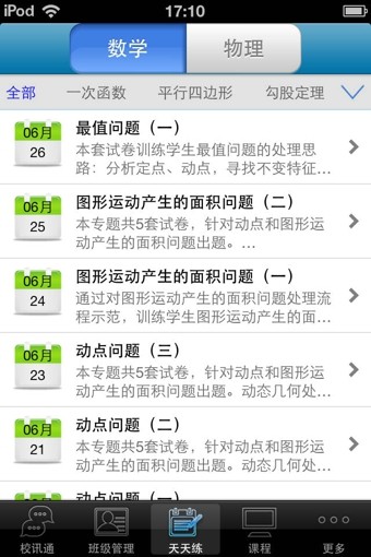 3.天天练:与在线课程相结合,每天一套试卷,用于检测学生课堂学习效果。每套试卷都配有试卷分析,提供详细解题思路,经典题型提供试题精讲(微视频),帮助学生更好地掌握思考方向与解题套路。网站自动汇总错题,并分析错题中暴露的学习薄弱点,推荐适合学生使用的课程和习题。天天练也支持通过章节知识点来筛选想要的试题,便于学生针对性查漏补缺。