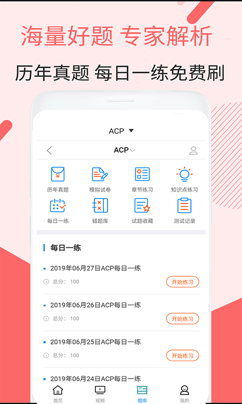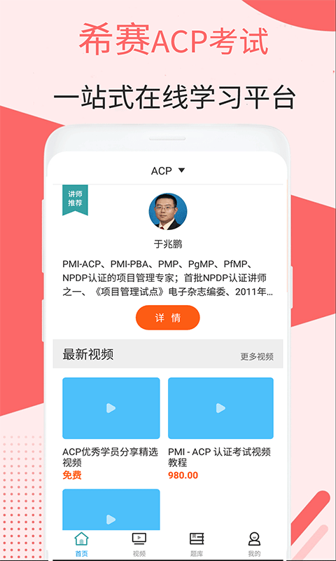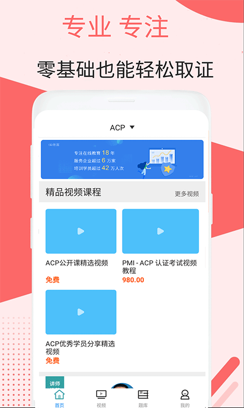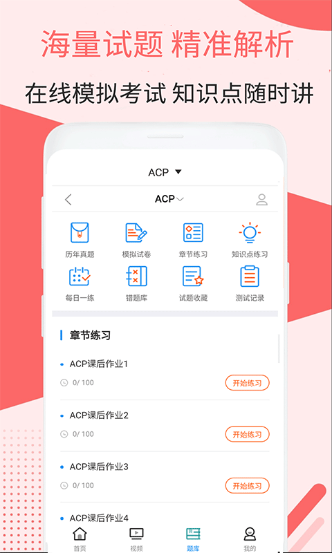 ACP视频课件APP涵盖视频课程、直播课堂、自学学习包等等多种助考随身学功能。满足考生自学、刷题、听课等各种备考需求。帮助您在考试路上省时省力,顺利通过在线考试!
