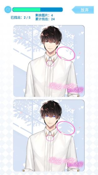 早安少女一起来找茬游戏是款充满甜蜜的爱情休闲手游,感受橙光般的温暖让甜美的声音将你唤醒,在美男子中找出不同,今晚不太冷好好寻找答案,来游戏下载体验!