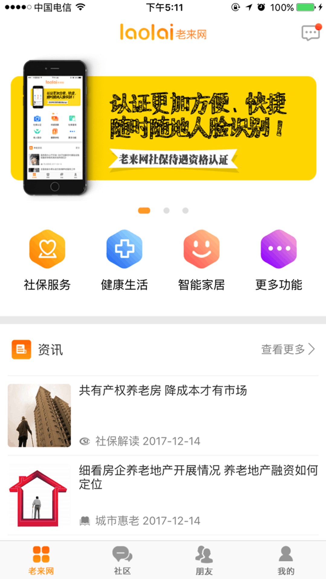 老来网人脸识别认证app是一款很好用的互联网养老服务应用,通过强大的人脸识别技术,打造了手机端社保认证服务。老人可以通过老来网社保认证app非常方便地搞定社保认证,不方便的话也可以让家人协助认证,无需出门前往社保部门在家中就能搞定,赶紧下载使用吧。