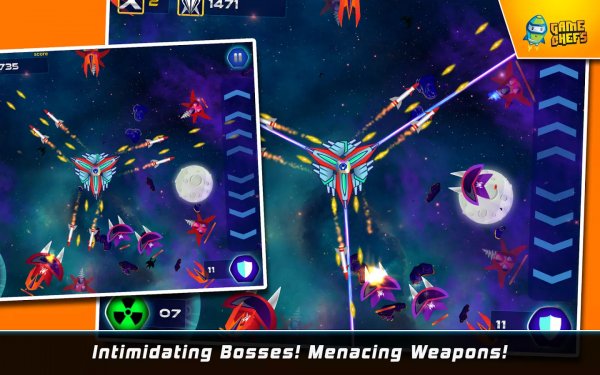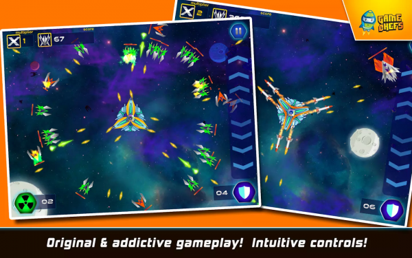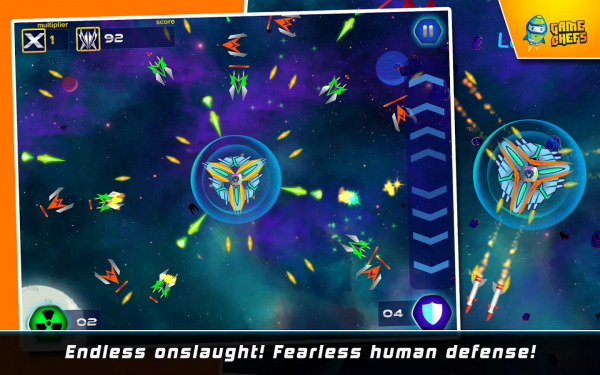 银河防御是一款生存类的射击游戏。在游戏中,玩家只需一边操控战机击落敌人,一边尽可能地生存下来。游戏玩法非常简单,每次挑战都会有三个战机背靠背黏在一起,你要做的就是通过圆周式地划屏来对进犯的敌人发起攻击。