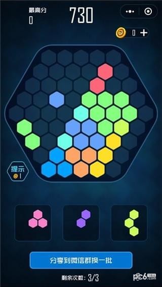 是一款在微信上十分火爆的消除益智游戏!游戏采用了经典的六边形消除元素,玩家将随机获取不同的六边形方块组合,你需要在有限的六边形格子之中,开启核心的消除和挑战,争夺消除更多的方块,超越你的好友吧!