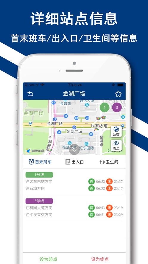 详细站点信息:站点首末班车时间,车站服务设施(卫生间和电梯等)、出入口信息等。
