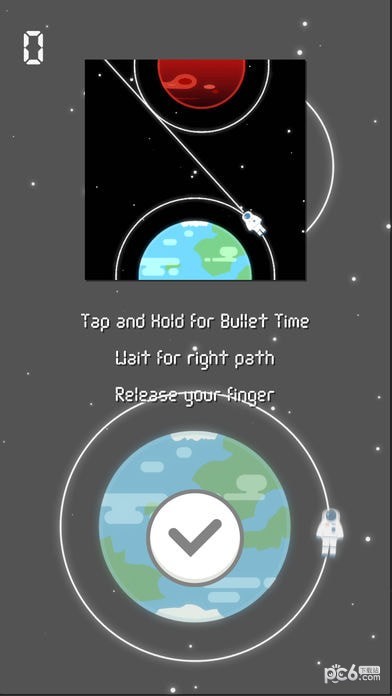 一个被宇宙中的引力弹弓效应启发的迷你游戏,你需要等待合适的时机进入星球轨道,不然就会迷失在太空中,环绕星球时按住屏幕启动子弹时间。