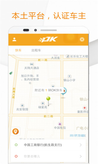 "OK出行"为您提供更及时、更准确、更便捷的出行服务,将线上与线下相融合,从打车初始阶段到下车使用线上支付费用,画出一个乘客与司机紧密相连的O2O完美闭环!