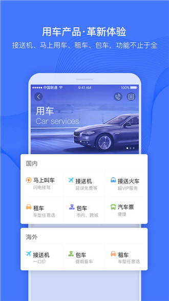 【用车预订】“马上叫车”企业员工上下班打车、拜访客户马上用车、预约用车、还可以为他人叫车;“国内国际接送机、火车服务”出差更舒心、省去排队等出租车烦恼,根据航班、火车票信息安排接送时间,靠谱省心。