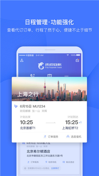 【机票预订】通过携程企业商旅客户端随时随地预订国内全部航线及协议航空,国际主流航线的单程、往返机票、多段和缺口行程报价;手机自动值机,提前预约在线选座;航班提醒、退票改签尽在掌握!