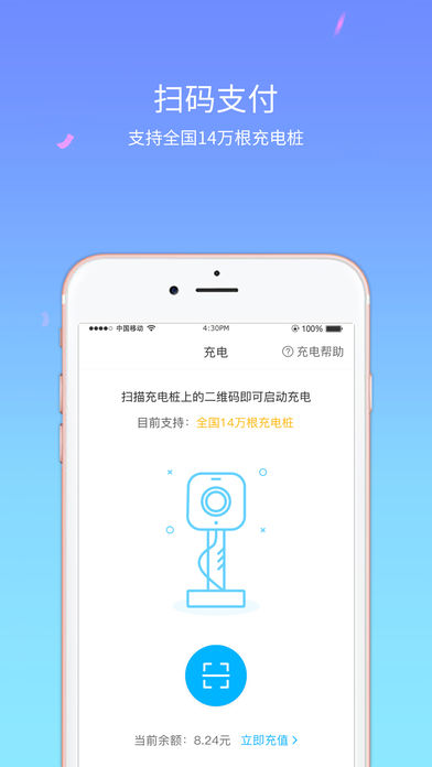 扫描电桩二维码 充电更方便:用户充电将充电插头插到车上后,可直接用手机扫描电桩屏幕上的二维码,绑定成功后可直接点击"开始充电"按钮即可开始计时计费充电