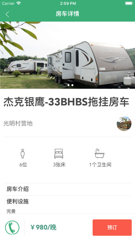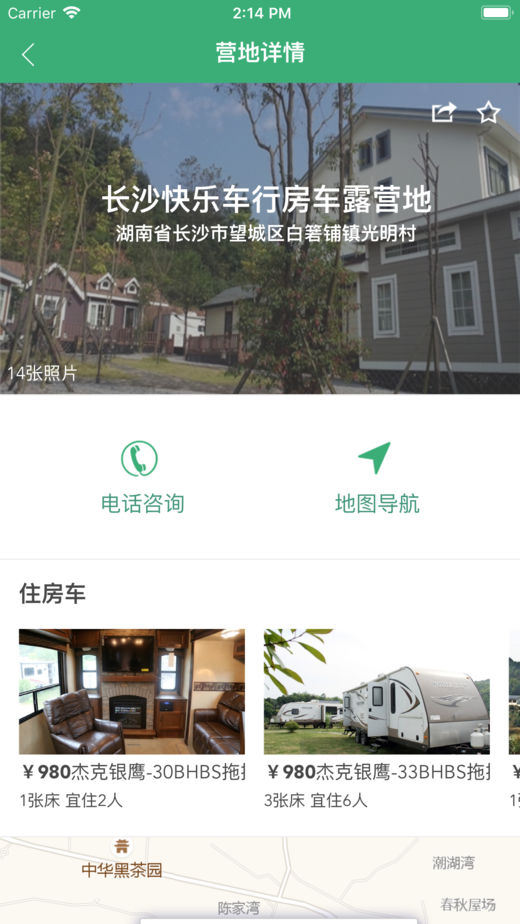 租赁房车:平台提供海量多款房车(自行式房车、拖挂式房车、木屋别墅等)线上一站式租赁、预定、全国加盟露营地一键导航等功能。