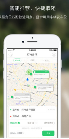 智能推荐,快捷取还:根据定位匹配较近网点,显示可用车辆及车位