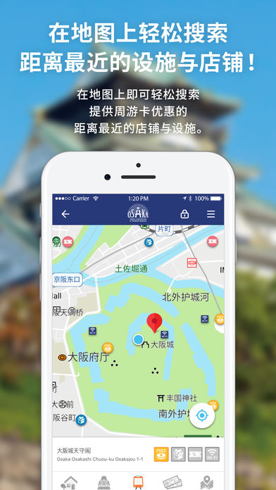 另外,能够通过当前位置地图确认周边设施,并且,已购买大阪周游卡的游客通过登录乘车卡条形码编号,即可进行前往目的地的路线搜索,或在超值店铺中使用折扣等优惠券。