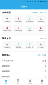 首页:车辆30天内概要、违章纵览、提醒统计一目了然