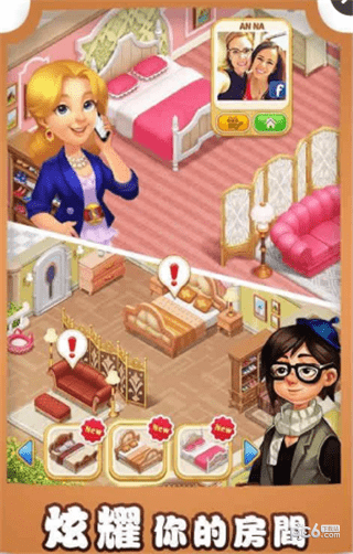 融合经营,消除,装扮等多种玩法元素的卡通画风休闲手游,游戏中玩家可以挑战三消关卡来收集资源,购买家具和材料来装潢自己的家