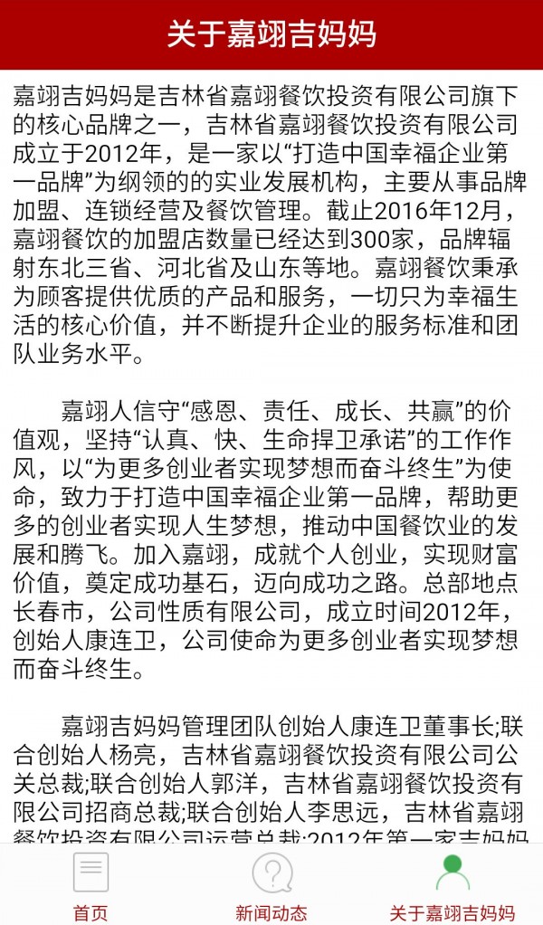嘉翊吉妈妈管理团队创始人康连卫董事长;联合创始人杨亮,吉林省嘉翊餐饮投资有限公司公关总裁;联合创始人郭洋,吉林省嘉翊餐饮投资有限公司招商总裁;联合创始人李思远,吉林省嘉翊餐饮投资有限公司运营总裁;2012年第1家吉妈妈手擀面直营店开业,在第二家、第三家直营店开业后,有了统一的标准、模式和独有的品牌文化;2012年吉林省嘉翊餐饮投资有限公司成立,开始吉妈妈手擀面连锁加盟店模式;2013年吉妈妈手擀面在吉林省达到50家;2014年吉妈妈手擀面在吉林省达到150家;2015年吉妈妈手擀面品牌辐射东北三省,加盟商达到260家;2016年吉妈妈手擀面品牌市场辐射东北三省、山东省以及河北省等区域。
