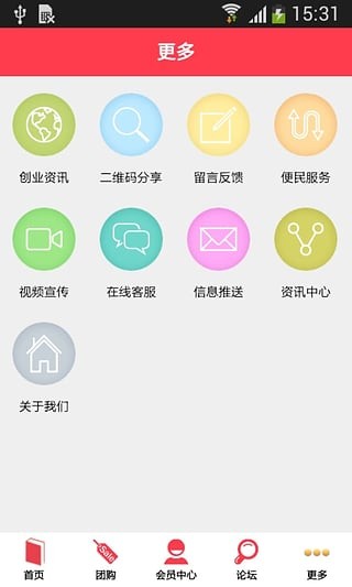 【首页】:本应用专门为用户提供各企业信息咨询的平台,用户可以快捷地从这里了解企业。【团购】:本应用提供相关各种产品分类,方便客户查询购买。【会员中心】:用户可以通过这里注册自己专属的会员帐号。【留言反馈】:用户可以把意见和建议以及评价等信息反馈给商家,以提高服务质量。【关于我们】:用户可以通过【一键拨号】、【一键导航】轻松联系到服务商(介绍信息增加联系人一栏)。【二维码分享】:二维码图片由运营商通过后台上传更新。 更多精彩信息等你来发现!