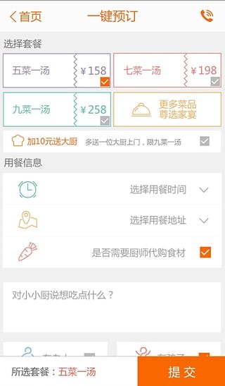 小小厨app是一款提供美味烹饪服务的客户端应用,小小厨覆盖面广,让您可以在线订餐,由高级厨师为您烹饪,各大菜系任您选择,让您迟到精品美味的佳肴,快来下载体验吧!