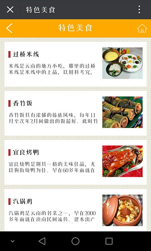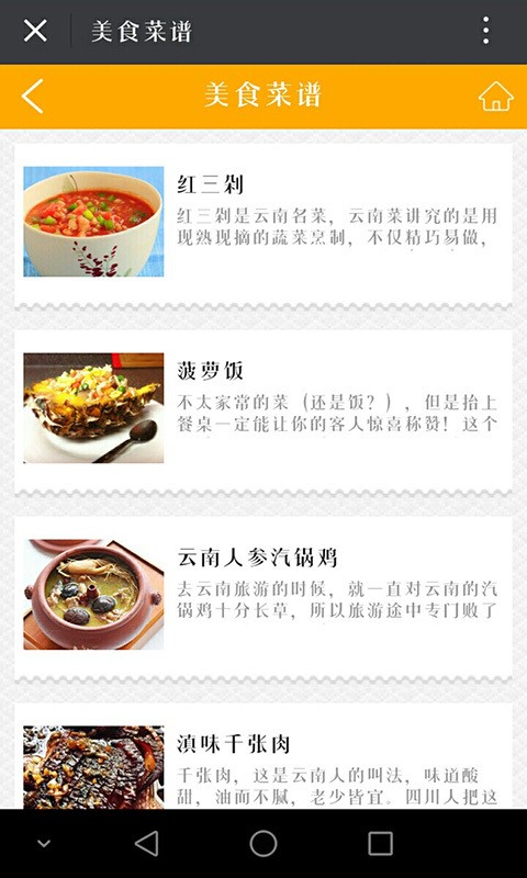 云南特色美食app是一款美食推荐应用,为用户推荐大量云南地区的特色美食,让用户可以了解云南当地的美食餐饮,品尝美食。