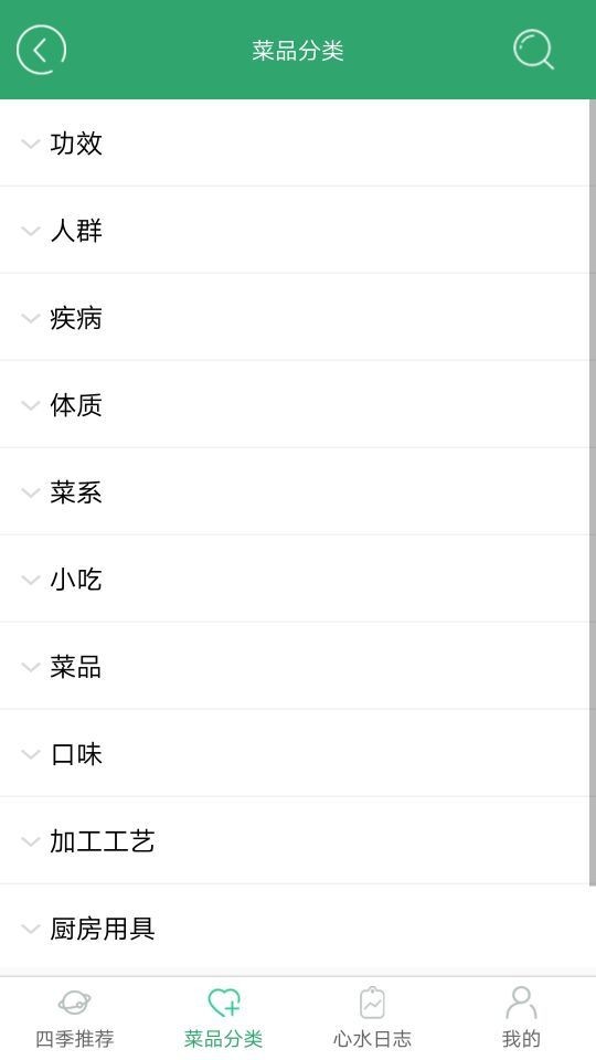 2 菜品分类:根据生活各个方向对菜品进行分类.如功效,人群,菜系,体质等.满足你生活所需.