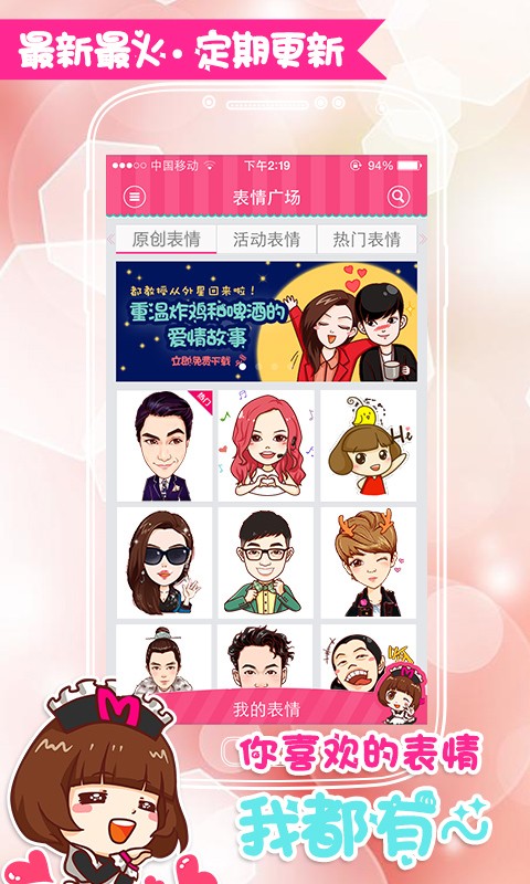 [表情广场] 目前表情mm拥有人气充满正能量的《咸蛋超人》正版授权的表情,搜狐视频2015年秋冬档自制大剧《他来了请闭眼》主创的表情,还有让全世界陷入暖心童年回忆的《小王子》表情...每周还会持续更新热点表情,表情数量无穷大噢~