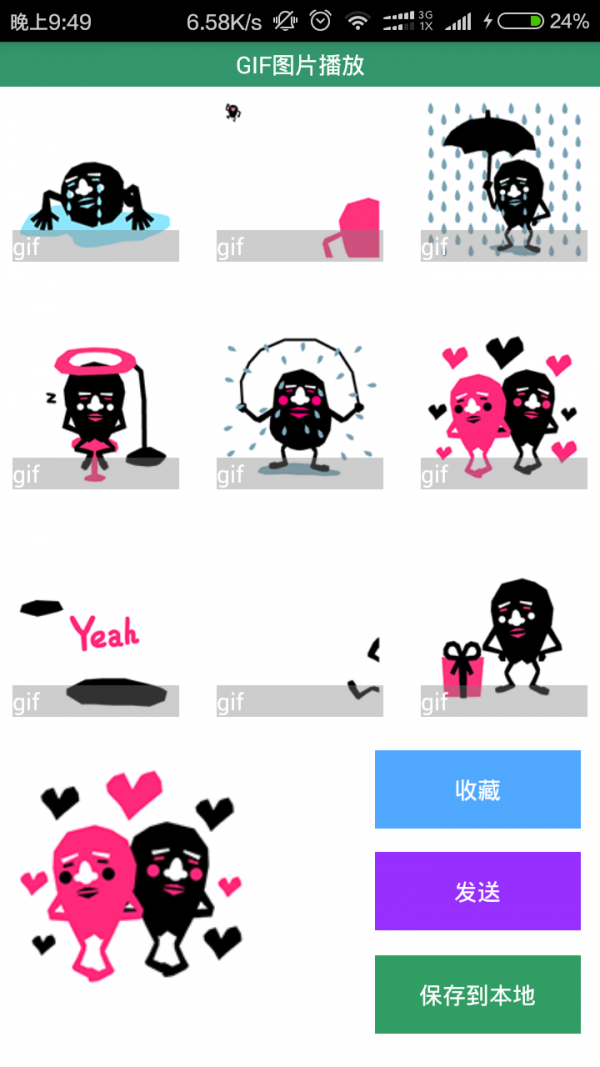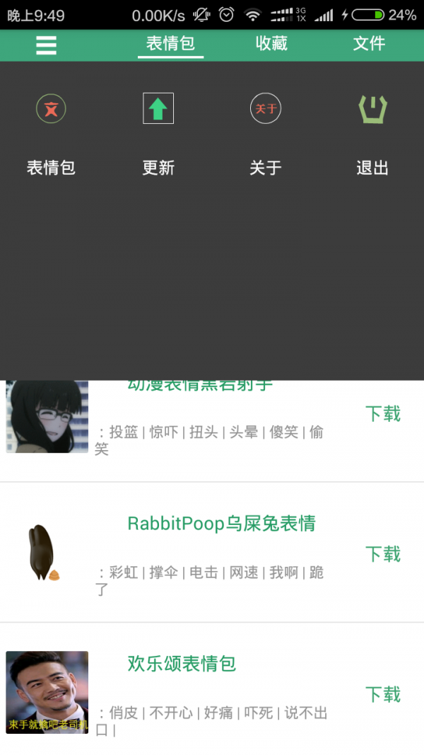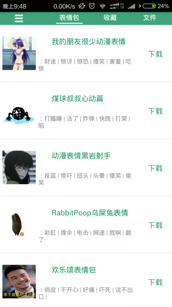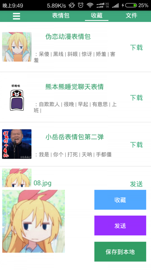 2.表情包可收藏 ,发送,下载,(上传分享(开发中...)制作表情图(开发中..))