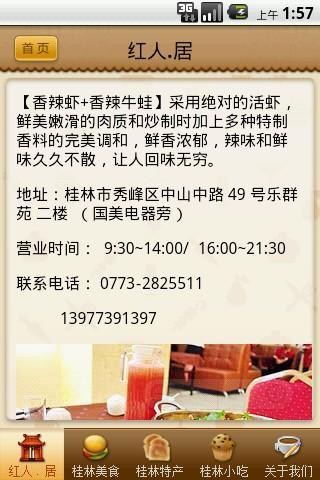 桂林美食 桂林不仅山水甲天下,而且米粉也很有名,它圆细、爽滑、柔韧,具有独特的风味。桂林美食提供最详尽的桂林旅游特色美食,包括桂林小吃大全、桂林特色菜肴、桂林特产等桂林美食信息,为广大游客提供最好、最有价值的桂林美食资讯。 红人居是一家以经营香辣系列为主,传统火锅为辅的时尚火锅店。 软件还带有周边定位功能,快速的寻找到周边的餐厅美食、商场超市、停车服务等等,让用户更方便的体验移动生活服务平台。