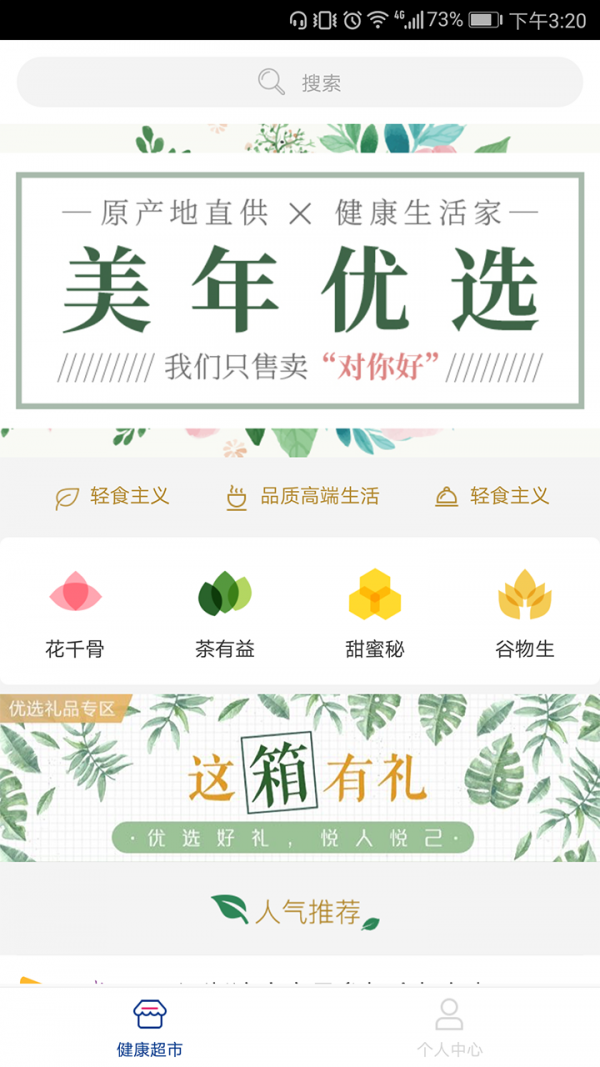 是一款只售优质健康食品,原产地发货,分类详细的app。我们有花千骨,茶有益,甜蜜蜜,谷物生,这箱有礼五大分类,首页还有人气推荐,为您推荐人气产品。