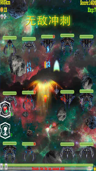 简单又好玩的游戏模式.玩家摧毁敌机后,有一定的几率掉落无敌冲刺道具,当玩家拾取了这个道具后,会发动无敌冲刺技能,并快速的突破敌军防线,并当沿路碰到的敌军灰飞烟灭