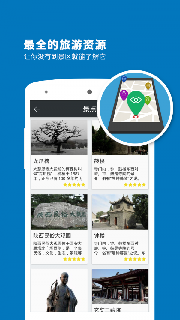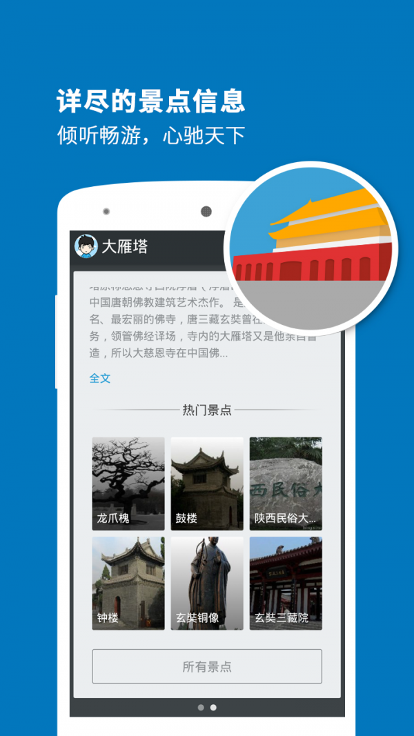 大雁塔导游app是一款旅游出行类应用,大雁塔导游app拥有精确的导航功能、详细攻略以及个性游记,为用户提供全方位的旅游服务,尽享轻松自在的旅游体验。