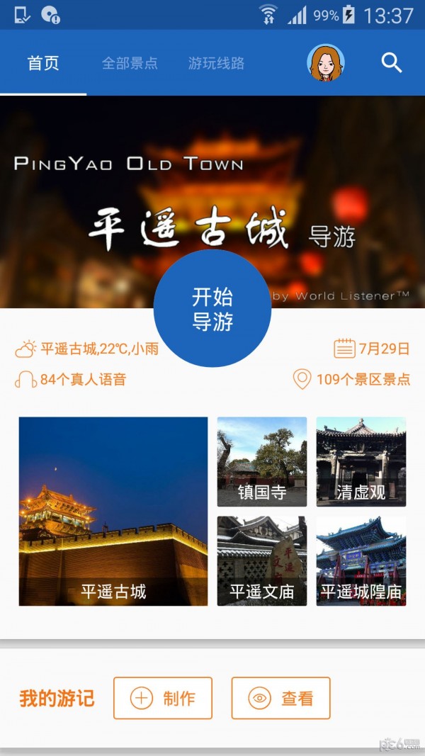 听游天下——平遥古城导游:专业的智能语音导游系统,专为喜欢自由行的旅行爱好者而设计。携手科大讯飞,带给您独特的平遥古城印象。