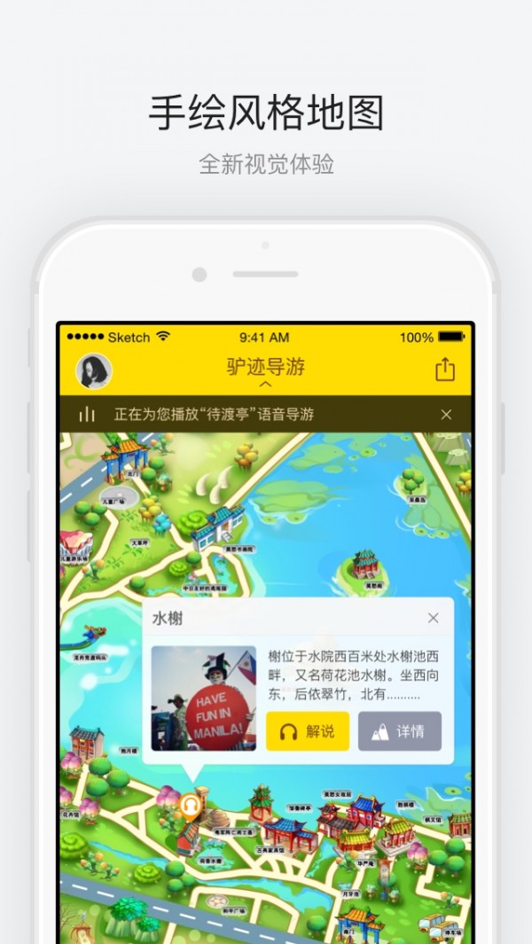 语音导游:专业主播录制的景点讲解及到点播报,多语种支持,走到哪儿听到哪儿。