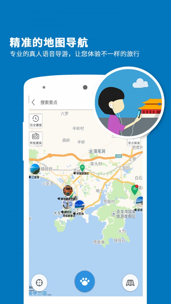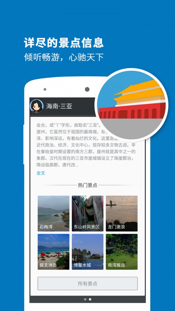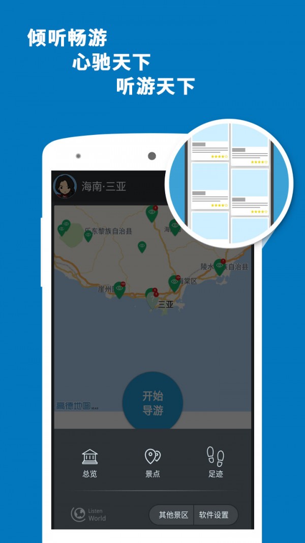 听游天下——三亚导游:专业的智能语音导游系统,专为喜欢自由行的旅行爱好者而设计。携手科大讯飞,带给您独特的海南三亚印象。