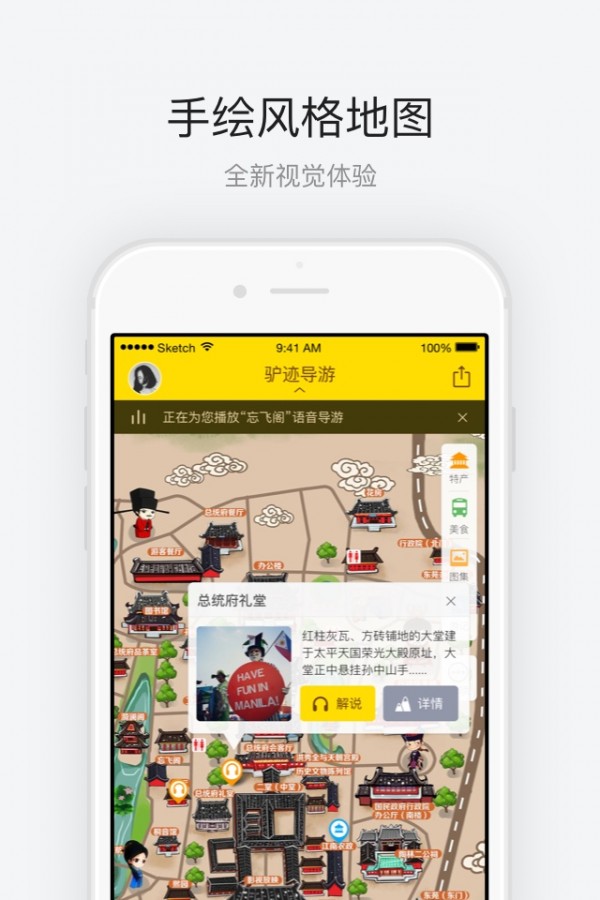 语音导游:专业主播录制的景点讲解及到点播报,多语种支持,走到哪儿听到哪儿。
