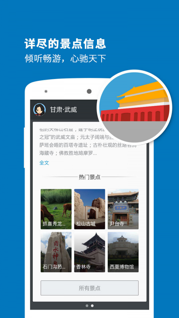 听游天下——武威导游:全球最专业的智能语音导游系统,专门为喜欢自由行的旅行爱好者而设计。携手科大讯飞,带给您独特的武威印象。