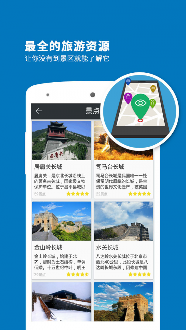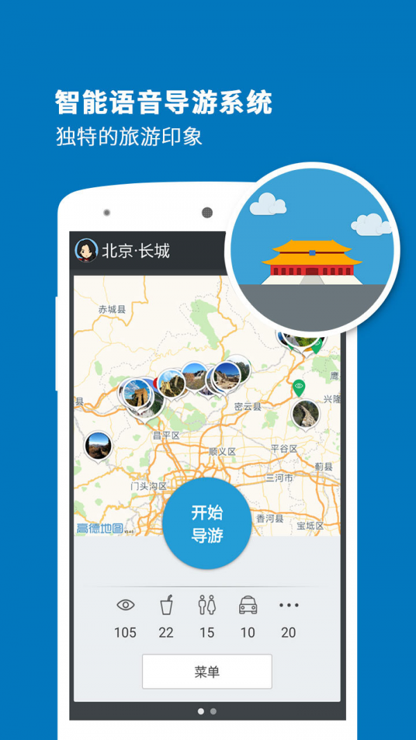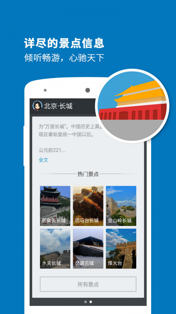 长城导游app是一款智能导游软件,通过长城导游app你就像拥有了一个私人导游一样,它会很清楚的告诉你长城的各种故事和旅游信息,还不会强买强卖。