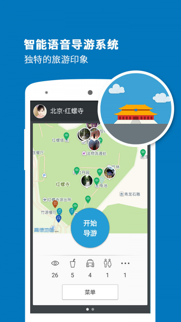 导游-独创的步行和行车导游双模式随您选择,通过GPS定位为您精准播报每个景点的历史文化和内涵
