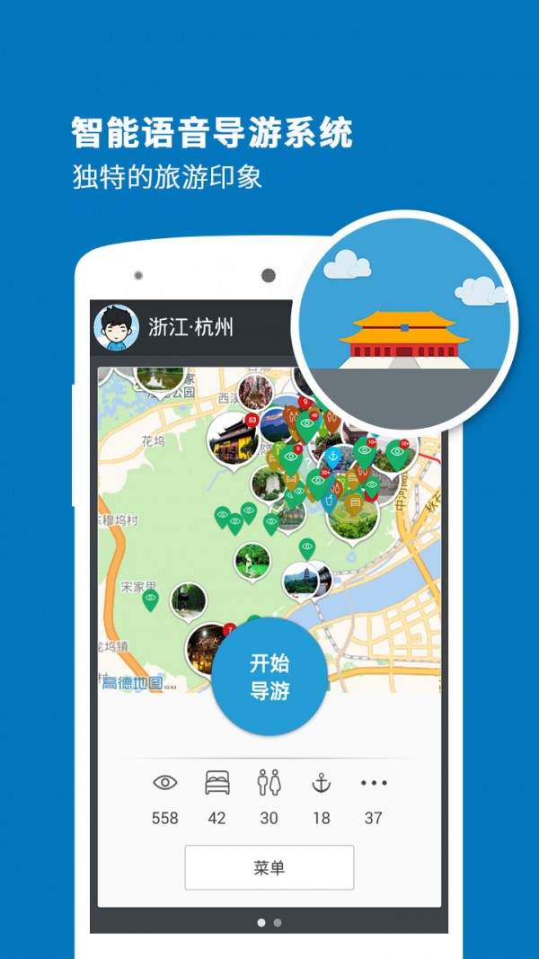 杭州导游app是一款专业的智能导游助手,具备语音自动播报导游系统,助您在手机上轻松搞定旅游所需的吃住行。杭州导游app,您掌上的私人导游,伴您旅游好心情,带给您独特的杭州印象。