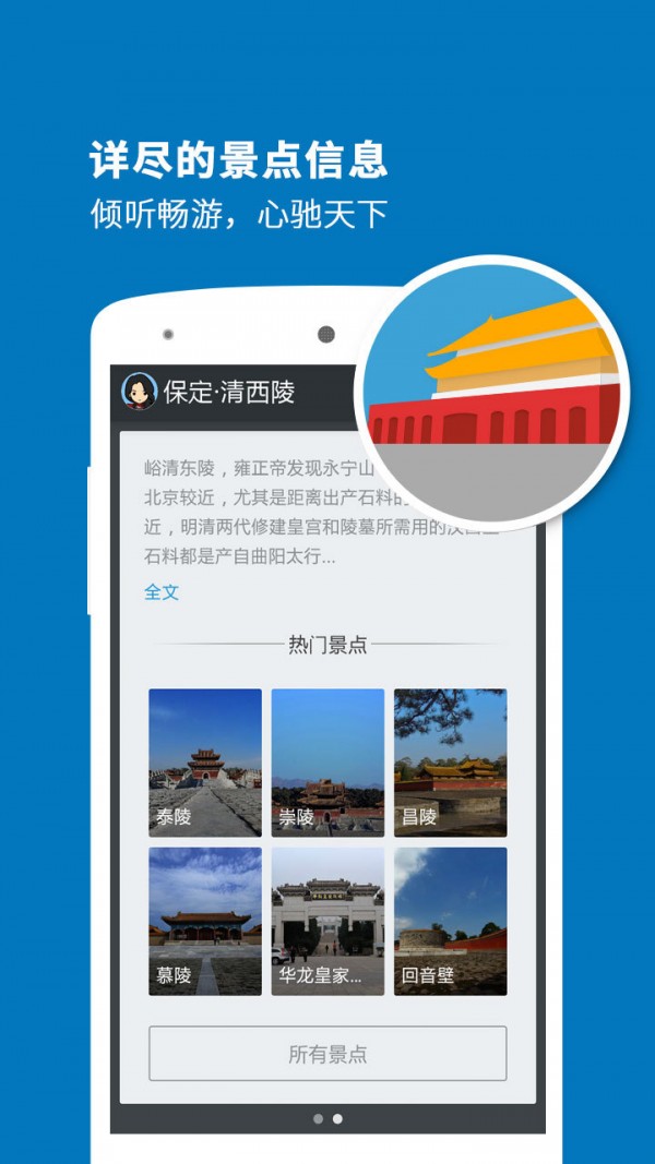 清西陵导游app是一款为用户提供专业的清西陵旅游导演软件。清西陵导游app采用智能语音导游系统,携手科大讯飞,带给您独特的清西陵印象。有需要的朋友快下载体验吧!