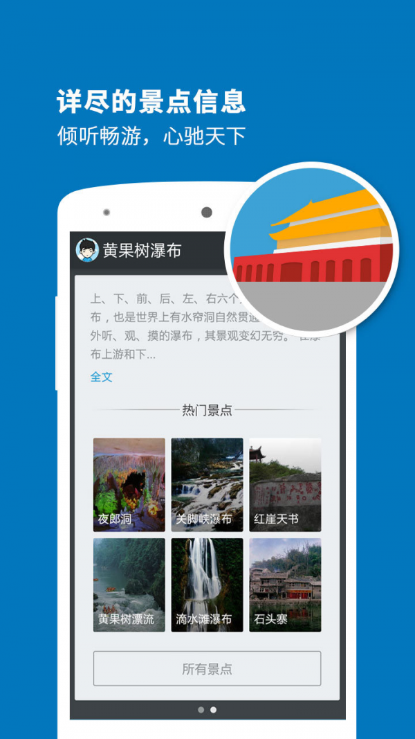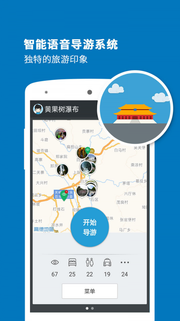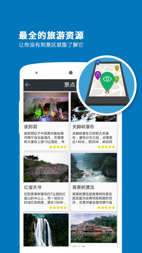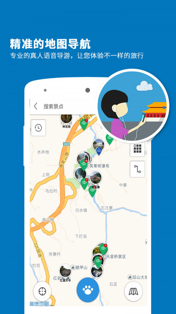 黄果树瀑布导游app是一款只能导游系统,通过黄果树瀑布导游app你可以把你的手机当做你的导游,并且这个导游还不会强买强卖,随时随地的为你个人服务。