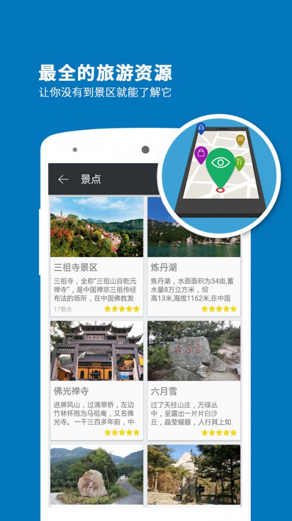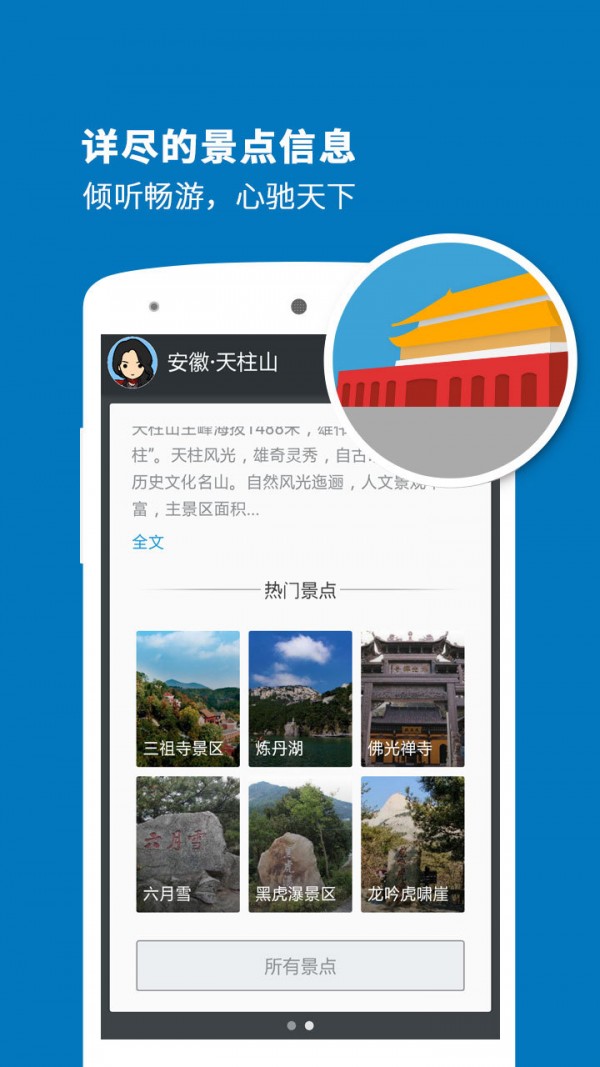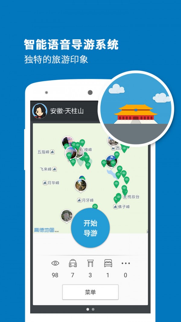 天柱山导游app是一款专业的智能语音导游系统,专门为喜欢自由行的旅行爱好者而设计,当您漫步在景区时,天柱山导游能根据当前您所处的景点位置,为您提供生动的语音解说及详尽的图文介绍,让您体验到景区身临其境的愉悦感。