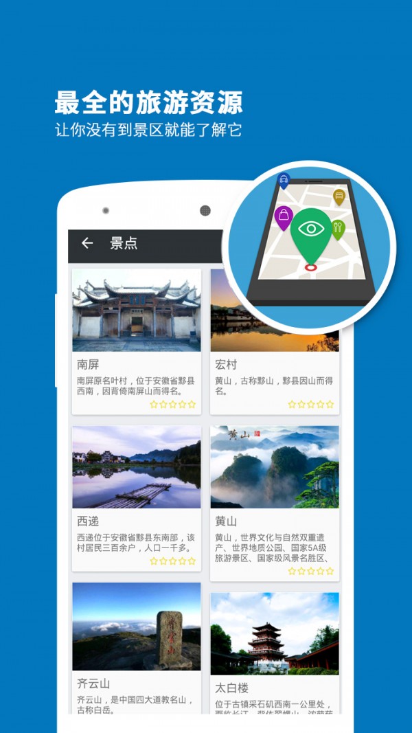 黄山导游app是一款专为旅游爱好者设计的导游系统,提供步行和行车导游双模式,为用户提供门票购买、酒店预订、交通查询等一站式旅游服务,下载黄山导游app,做您的私人导游。