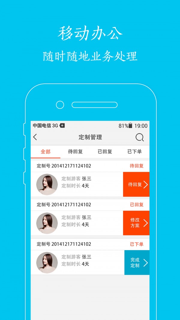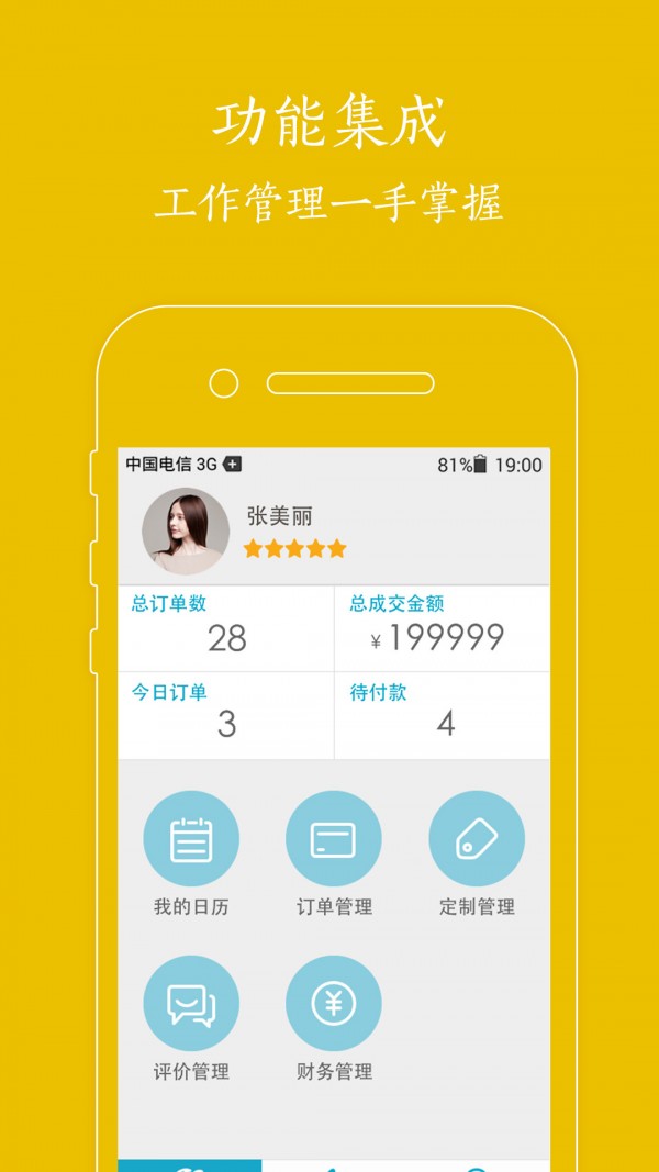 -工作台:“工作台”定位于“移动办公”,是去游旅行网平台针对导游户外工作时间较多而设计,下设“我的日历”、“订单管理”、“定制管理”、“评价管理”、“财务管理”五个功能模块,后期版本更新中将陆续新增“通讯录”、“资讯服务”等功能。
