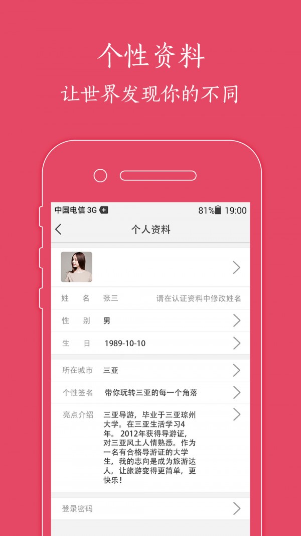 -我的:“我的”是导游在去游旅行网平台的用户中心,导游可以通过手机上传审核资料认证成为去游旅行网平台导游,也可以修改通过“我的”修改个人基础信息,如个人资料、服务信息及认证资料。