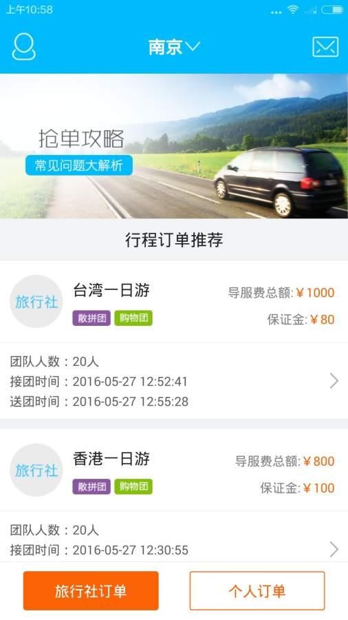 无论个人行程订单还是旅行社行程订单,一键抢单,方便快捷,在大幅提升导游合理收入的同时,充分保障导游权益,旨在为自由导游打造一个拥有海量出游订单的兼职平台。