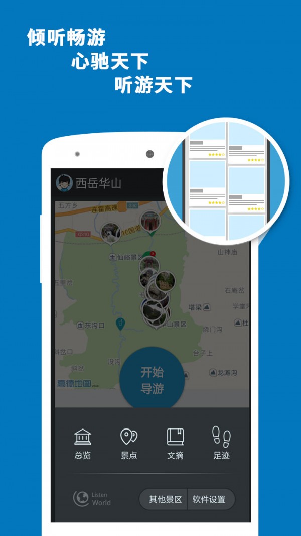 听游天下——华山导游:专业的智能语音导游系统,专为喜欢自由行的旅行爱好者而设计。携手科大讯飞,带给您独特的华山印象。
