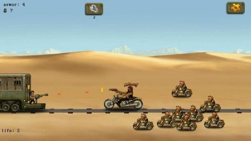 沙漠突袭是一款卡通风格的射击游戏,玩家在游戏中面对源源不断到来的敌人进行射击,还有大量武器装备现代化武器装备等供你使用,玩家在火车上,敌军在后头追赶,摩托车,飞机通通上场。你利用手中的枪械、手榴弹给他们一击吧!