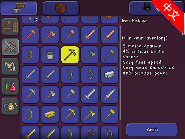 《泰拉瑞亚(Terraria)》与《Minecraft》一样走的是像素风格路线,这好像已经成了沙盒类游戏约定俗成的规定,又或许是因为像素的结构比较易于构造物体。不过虽同属像素一路,但泰拉瑞亚的画面在细腻程度上会稍好一些。既然是一款沙盒类游戏,重点就不要放在画面上了,极高的自由度才是游戏的重点。从PC端到移动端,操作方式上自然要适应触屏的需求。在触屏上,左边屏幕控制方向,右边则是负责所有的采矿、伐木、攻击方、还可以通过点击物品栏使用物品以及和NPC交谈。初玩该作的玩家会觉的游戏的人物偏小,还好在点击精度上还是能够保证的。