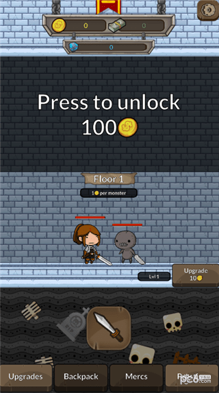 游戏是一款复古像素的地下城冒险战斗手游,游戏以城堡为背景,游戏玩家操控角色进行前后移动,点击式使用武器技能击杀怪物,来获取药水等等,一直向前闯关。
